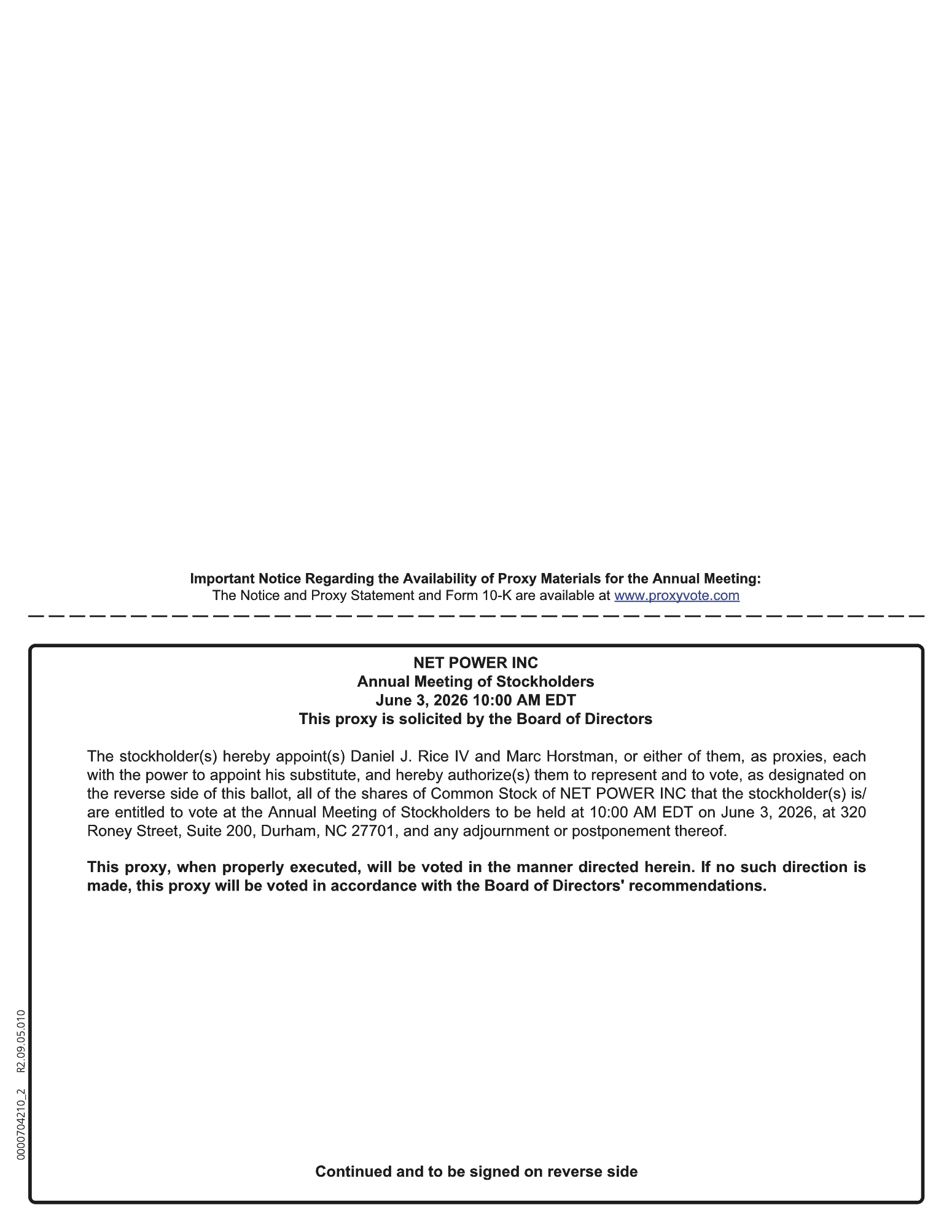 On June 2, 2025, Net Power granted to Mr. Horstman 240,000 options to purchase shares of Class A Common Stock with an exercise price of $2.13 per share and an expiration date of June 2, 2030. The stock options vest and become exercisable on June 2, 2026.